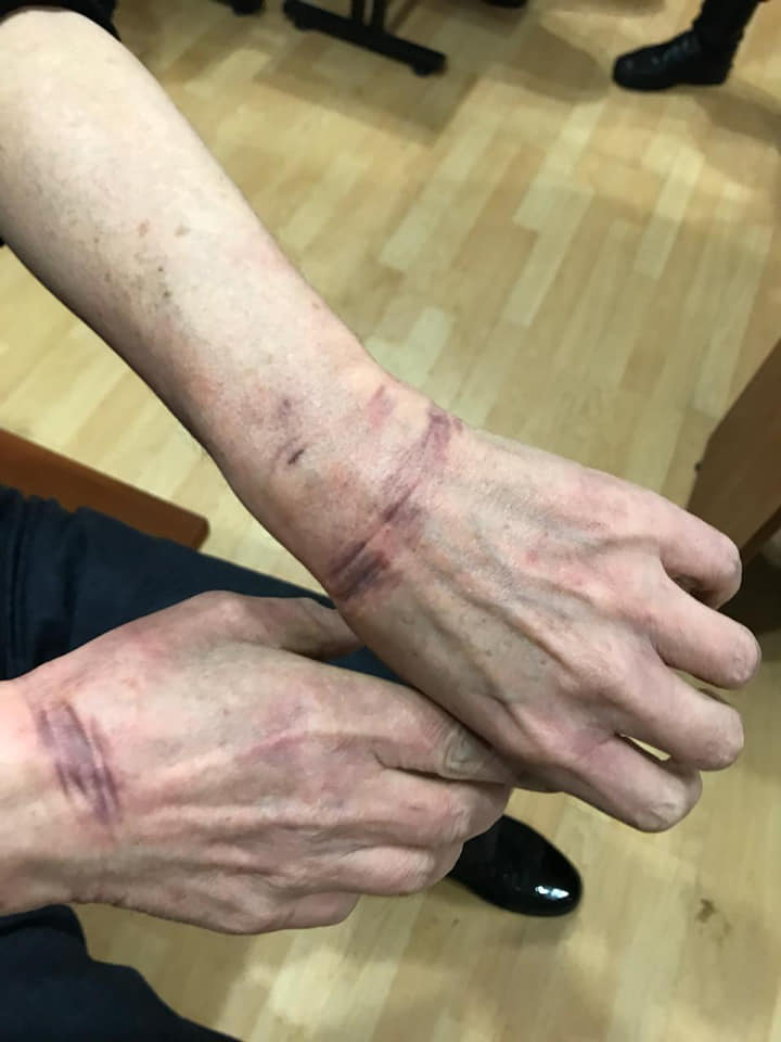 Фото рук экс-нардепа со следами от наручников, после того, как его втащили в зал судебного заседания, обнародовал в Facebook его адвокат Евгений Солодко.