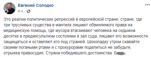 "Это реалии политических репрессий в европейской стране, стране, где три трусливых существа в мантиях лишают обвиняемого права на медицинскую помощь, где мусора втаскивают человека на седьмом десятке в прединсультном состоянии в зал суда, лишают его возможности защищаться и оставляют его под стражей...", - написал Евгений Солодко.