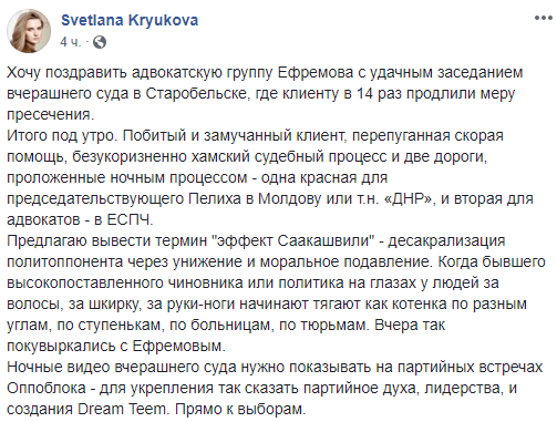 "Хочу поздравить адвокатскую группу Ефремова с удачным заседанием вчерашнего суда в Старобельске, где клиенту в 14 раз продлили меру пресечения. Итого под утро. Побитый и замучанный клиент, перепуганная скорая помощь, безукоризненно хамский судебный процесс и две дороги, проложенные ночным процессом - одна красная для председательствующего Пелиха в Молдову или т.н. "ДНР", и вторая для адвокатов - в ЕСПЧ.