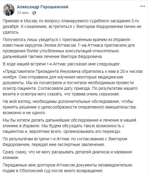 "Приехал в Москву по вопросу планируемого судебного заседания 5-го декабря. К сожалению, встретиться с Виктором Федоровичем лично не удалось. Получилось лишь увидеться с приглашенным врачем из Израиля - известным хирургом Эялем Аттиасом. Г-на Аттиаса пригласили для проведения более углубленных консультаций относительно дальнейшей тактики лечение Виктора Федоровича", - написал Горошинский.