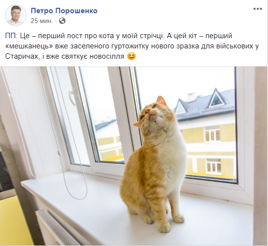 По словам Петра Порошенко, это фото первого "жителя" нового общежития для военнослужащих во Львовской области. "Это - первый пост про кота в моей ленте. А этот кот - первый "житель" уже заселенного общежития нового образца для военных в Старичах, и уже празднует новоселье", - написал президент.