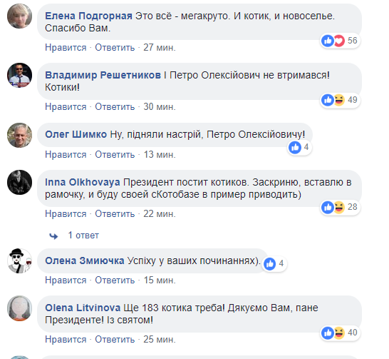Пользователи соцсети пришли в восторг от милого и необычного фото в ленте президента на официальном аккаунте в Facebook. "Это все - мегакруто. И котик, и новоселье. Спасибо Вам", "Петр Алексеевич не удержался. Котики!", "Ну, подняли настроение, Петр Алексеевич", "Президент постит котиков. Заскриню, вставлю в рамочку...", - не унимаются комментаторы.