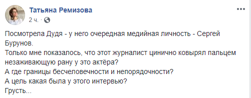 "Посмотрела Дудя - у него очередная медийная личность - Сергей Бурунов. Только мне показалось, что этот журналист цинично ковырял пальцем незаживающую рану у это актера? А где границы бесчеловечности и непорядочности? А цель какая была у этого интервью? Грусть...", - написала Татьяна Ремизова.