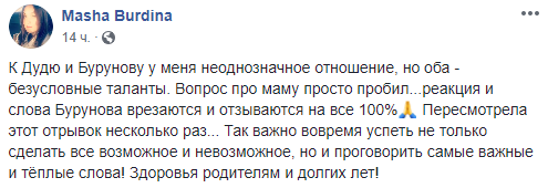 "К Дудю и Бурунову у меня неоднозначное отношение, но оба - безусловные таланты. Вопрос про маму просто пробил...реакция и слова Бурунова врезаются и отзываются на все 100%. Пересмотрела этот отрывок несколько раз... Так важно вовремя успеть не только сделать все возможное и невозможное, но и проговорить самые важные и тёплые слова! Здоровья родителям и долгих лет", - написала Маша Бурдина.