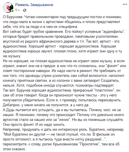 "О Бурунове. Читаю комментарии под предыдущим постом и понимаю, что люди мало в жизни с артистами общались и плохо представляют себе, что это за люди и в чем их специфика. Вот сейчас будет грубое сравнение. Его поймут условные "аудиофилы", которые бредят правильными проводами, ламповыми усилителями, акустикой из редкого африканского дерева и т.п. Так вот, артист - это аудиосистема. Хороший артист - хорошая аудиосистема. Хорошая аудиосистема хорошо звучит, плохая плохо, хотя играют они одну и ту же музыку.