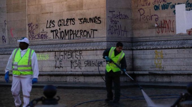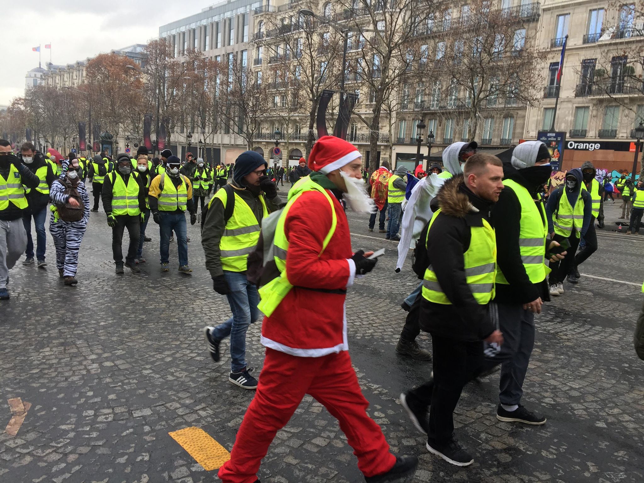Пик протестов пришелся на 1 декабря. Общее число протестующих по всей стране оценивалось полицией в 136 тысяч человек. Также не обошлось без погромов, поджогов машин, разрушений магазинов и банков. Была повалена ограда сада Тюильри, разграблены магазины в центре города, а символ Парижа Триумфальная арка разрисована граффити.