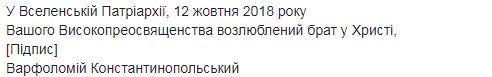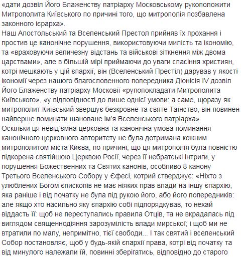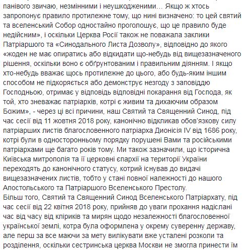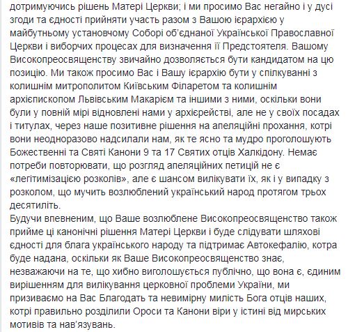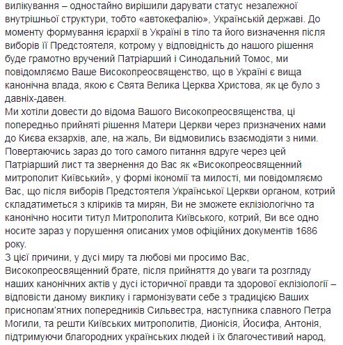 "До момента формирования иерархии в Украине в тело и его определение после выборов ее предстоятеля, которому в соответствии с нашим решением будет грамотно вручен Патриарший и Синодальный Томос, мы извещаем Ваше Высокопреосвященство, что в Украине есть высшая каноническая власть, которой является Святая Великая Церковь Христова, как это было с давних времен. Мы хотели довести до сведения Вашего Высокопреосвященства, эти предварительно принятые решения Матери Церкви через назначенных нами в Киев экзархов, но, к сожалению, Вы отказались взаимодействовать с ними. Возвращаясь сейчас к тому же вопросу второй раз за это Патриаршее письмо и обращение к Вам как "Высокопреосвященному митрополиту Киевскому", в форме икономии и милости, мы сообщаем Вам, что после выборов Предстоятеля Украинской Церкви органом, который будет состоять из клириков и мирян, Вы не сможете эклизиологично и канонически носить титул Митрополита Киевского, который, Вы все равно носите сейчас в нарушение описанных условий официальных документов 1686 года", – говорится в письме.