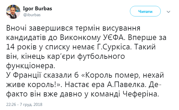 "Такой он, конец карьеры футбольного функционера. Во Франции сказали бы "Король умер, да здравствует король!". Наступает эра Павелко (президент Федерации футбола Украины Андрей Павелко - Прим.Ред.). Де-факто он уже давно в команде Чеферина", - написал Игорь Бурбас в Twitter.