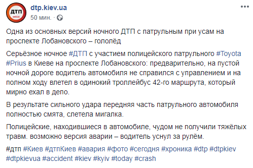 Ночью на проспекте Лобановского, предположительно из-за гололеда, полицейский Toyota Prius на полном ходу въехал в пустой троллейбус 42-го маршрута, который направлялся в депо. В результате аварии смяло переднюю часть служебной машины. Патрульные не получили серьезных травм.