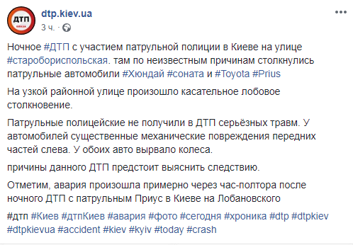 Уже спустя 1-1,5 часа на улице Старобориспольской уже другой служебный Toyota Prius столкнулся с автомобилем Hyundai Sonata. Разбилась левая передняя часть авто, сами патрульные также уцелели. Причина касательного лобового столкновения неизвестна.