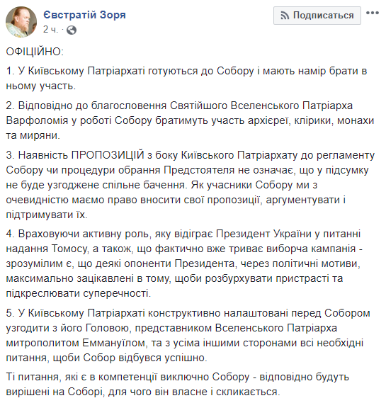 Об этом сообщает спикер УПЦ Киевского патриархата Евстратий Зоря на своей странице в Facebook.
