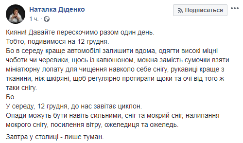 По информации Диденко, в среду, 12 декабря, в Киеве будет царить циклон. Именно он объяснит сильные осадки в столице. Ожидаются снег и мокрый снег, сильные порывы ветра и гололед.