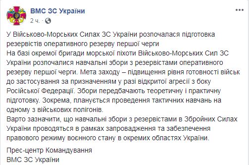 На базе отдельной бригады морской пехоты Военно-морских сил Вооруженных сил Украины начались учебные сборы с резервистами оперативного резерва первой очереди. Об этом 11 декабря сообщает пресс-центр командования ВМС ВС Украины в социальной сети Facebook.