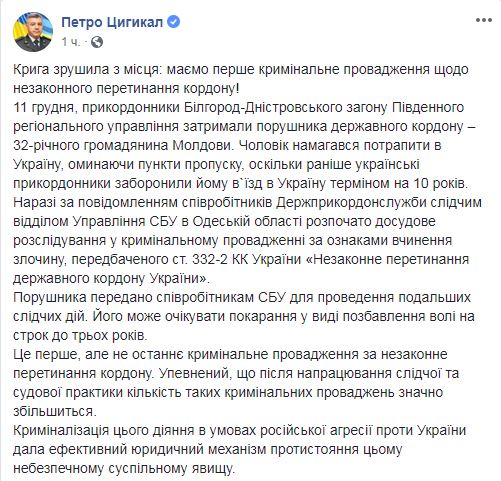 "Лед сдвинулся с места: есть первое уголовное производство по незаконному пересечению границы! Это первое, но не последнее уголовное производство за незаконное пересечение границы. Уверен, что после наработки следственной и судебной практики количество таких уголовных производств значительно увеличится", - написал Цигикал.