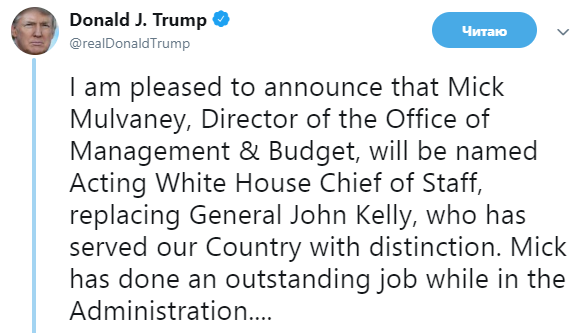 "Мне приятно объявить, что Мик Малвени, директор службы бюджета и управления станет и.о. главы службы Белого дома и заменит Джона Келли, который служил нашей стране примерно..." - сказано в сообщении.