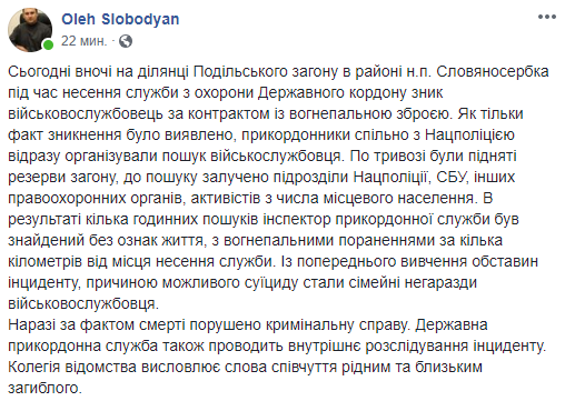 "Как только факт исчезновения был обнаружен, пограничники совместно с Нацполицией сразу организовали поиск военнослужащего. По тревоге были подняты резервы отряда, к поиску привлечены подразделения Нацполиции, СБУ, других правоохранительных органов, активистов из числа местного населения. В результате несколько часовых поисков инспектор пограничной службы был найден без признаков жизни, с огнестрельными ранениями в нескольких километрах от места несения службы. После предварительного изучения обстоятельств инцидента, причиной возможного суицида стали семейные неурядицы военнослужащего", - сообщил Слободян.