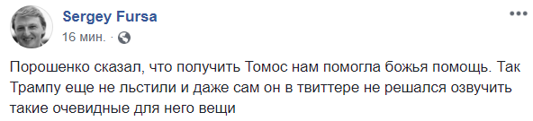 17:43 "Порошенко сказал, что получить Томос нам помогла божья помощь. Так Трампу еще не льстили и даже сам он в твиттере не решался озвучить такие очевидные для него вещи", - иронизирует блогер Сергей Фурса.