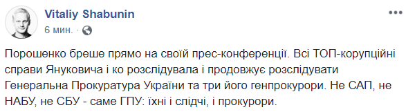 17:03 "Порошенко врет прямо на своей пресс-конференции. Все ТОП-коррупционные дела Януковича и ко расследовала и продолжает расследовать Генеральная Прокуратура Украины и три его генпрокурора. НЕ САП, а не НАБУ, не СБУ - именно ГПУ: их и следователи, и прокуроры", - реагирует на слова президента антикоррупционный активист Виталий Шабунин.