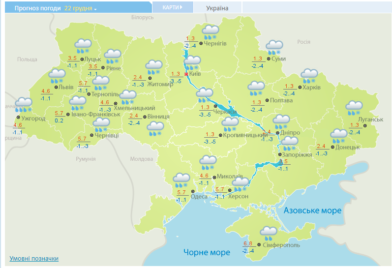 Кроме этого, по всей территории Украины 22 декабря пройдут дожди с мокрым снегом. Ветер юго-западный, 7 – 12 метров в секунду.