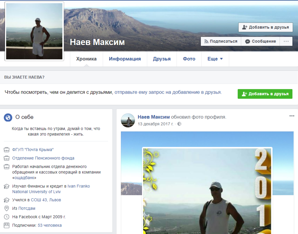 При этом очевидно, что скорее всего брат украинского военного получил паспорт РФ. Потому что он занимает там немаленькую должность - руководит пенсионным отделением в почте Крыма. Судя по странице в соцсетях.