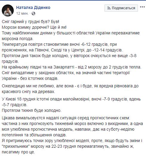 Во вторник, 18 декабря, в большинстве областей Украины будет преобладать морозная погода. Об этом на своей странице в Facebook пишет синоптик Наталья Диденко.