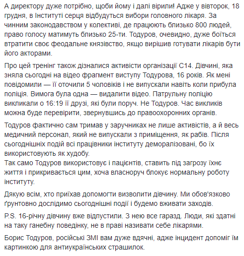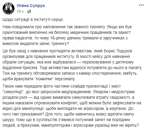 Однако в Минздраве снова поддержали националистов, а не врачей - и почти фразами С14 заговорила Ульяна Супрун. Она заявила в Facebook, что Борис Тодуров организовал специальный тренинг, где обучал сотрудников "симулировать потерю сознания", а другим приказал "спровоцировать конфликт", если в больницу придут радикалы.