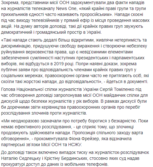 В частности, представители миссии ООН задокументировали два факта нападения на журналистов телеканала News One, "который крайне правые группы и группы сторонников единства часто называют пророссийским". Нападения были совершены во время выхода телевизионщиков в прямой эфир с места проведения массовых акций. По мнению авторов доклада, такие действия крайне правых групп сужают демократическое и гражданское пространство в Украине.