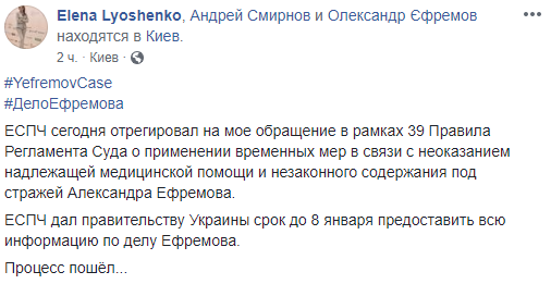 "ЕСПЧ сегодня отрегировал на мое обращение в рамках 39 Правила Регламента Суда о применении временных мер в связи с неоказанием надлежащей медицинской помощи и незаконного содержания под стражей Александра Ефремова. ЕСПЧ дал правительству Украины срок до 8 января предоставить всю информацию по делу Ефремова. Процесс пошел", - написала Лешенко.