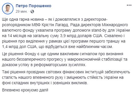 "Еще одна хорошая новость - как и договаривались с директором-распорядителем МВФ Кристин Лагард, Совет директоров МВФ принял программу помощи stand-by для Украины на 14 месяцев на общую сумму $3,9 млрд. Одобрено и решение о выделении в рамках этой программы первого транша на $1,4 млрд, который состоится в ближайшее время", – написал он.