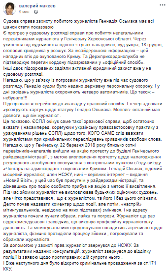 "Подозреваемые же перешли к "нападению правовым способом". И теперь адвокаты "разыгрывают карту" по статусу Геннадия Осьмака. Мол, последний должен доказать, что он журналист. Это показательно. ЕСПЧ ожидает именно такого образцового дела, чтобы окончательно указать (прежде всего, корректируя украинскую правоприменительную практику с учетом решений ЕСПЧ) на то, кого именно следует считать журналистами при уголовных преследованиях обидчиков свободы слова", - добавляет Макеев.