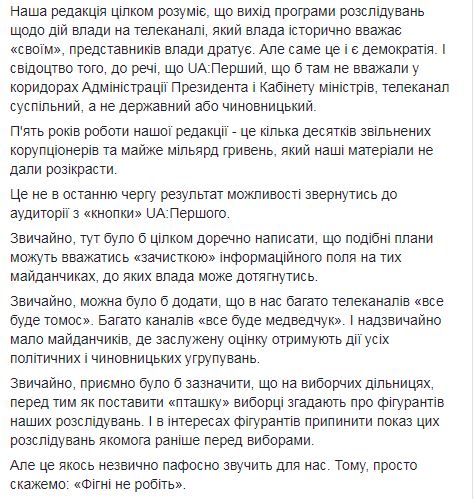 Программы "Наші Гроші" и "Схемы", которое провели десятки известных расследований (в том числе и против нынешней власти), могут исчезнуть из эфира UA:перший в связи с выборами. Об этом говорится в заявлении Bihus.info и руководителя проекта Дениса Бигуса в Facebook.