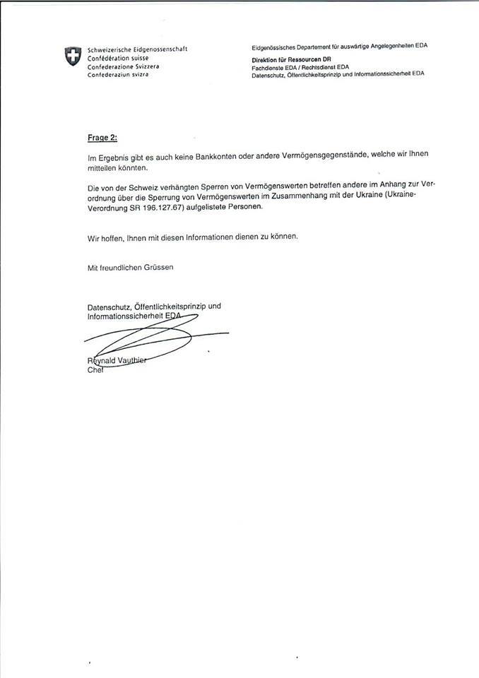 "(1) в Швейцарии нет банковских счетов или других активов на имя Президента Януковича, которые они заморозили (как и утверждает всегда сам Президент Янукович); а также