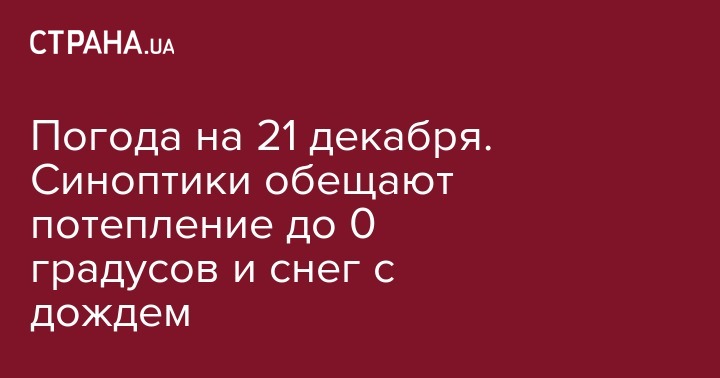 В пятницу, 21 декабря в Украине отступят морозы. В среднем, днем в стране ожидается температура воздуха около 0 градусов. Практически всю территорию накроют осадки - снег или снег с дождем. Сухо и пасмурно будет только на юге Украины и в Черновицкой области. Об этом сообщается на сайте Укргидрометцентра.