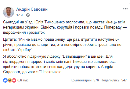 Глава партии "Самопомощь" Андрей Садовой призвал руководителя "Батькивщины" Юлию Тимошенко, которую ее политсила выдвинула кандидатом в президенты 22 января, снять свою кандидатуру с выборов в его пользу. Об этом он написал на своей странице в Facebook.