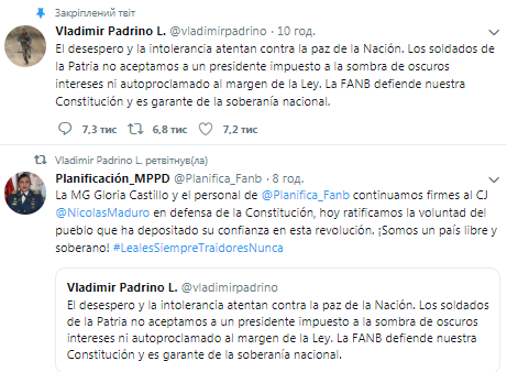 Так, министр обороны Владимир Падрино Лопес заявил в своем Twitter, что армия будет поддерживать президента.