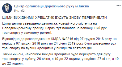 "Таким образом, в ближайшие выходные Крещатик будет перекрыт для движения транспорта: в субботу, 26 января, с 19:00 до 22:00, в воскресенье, 27 января, с 10:00 до 22:00", - говорится в сообщении.