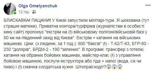 "Я шокирована. Частная контора/турфирма предлагает экстрим на военном полигоне/военной базе в 80 км юго-западнее Киева. Экстрим = катание на военных машинах", - пишет она.