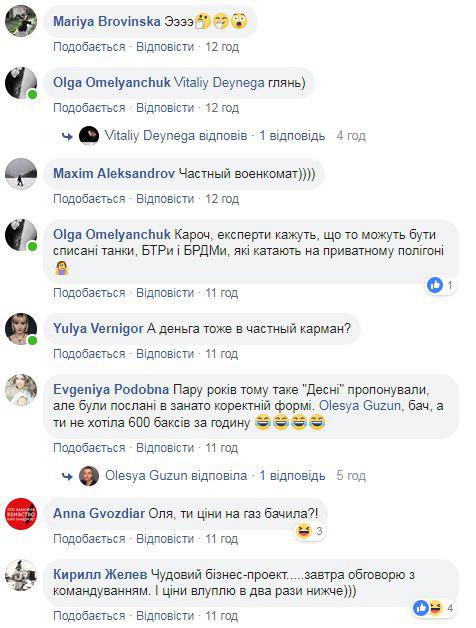 "Частный военкомат", "А деньга тоже в частный карман?", "Оля, ты цены на газ видела???", "Чудесный проект. Завтра обсужу с командованием. И цены влуплю в два раза ниже", "Судя по координатам — это где-то в районе Белой Церкви. Может то-то из 72 ОМБр промышляет", "Покатушки на демилитаризованных БТР и "бардаках" - это законно а вот на Т-64 - верю слабо. если это работает, то без связей и коррупции в ВСУ обойтись очень тяжело", -  пишут пользователи сети.