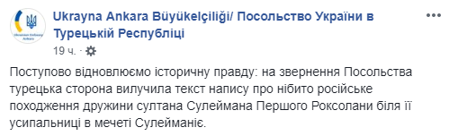 "Постепенно восстанавливаем историческую правду: по обращению посольства турецкая сторона изъяла текст надписи о якобы российском происхождении жены султана Сулеймана Первого Роксоланы около ее усыпальницы в мечети Сулеймание", - сказано в сообщении димписсии.