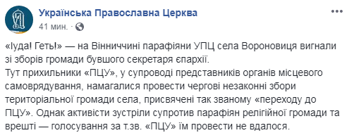 В Винницкой области прихожане Украинской православной церкви (МП) села Вороновица выгнали с собрания общины бывшего секретаря епархии, пытавшегося в сопровождении чиновников провести голосование "за ПЦУ".