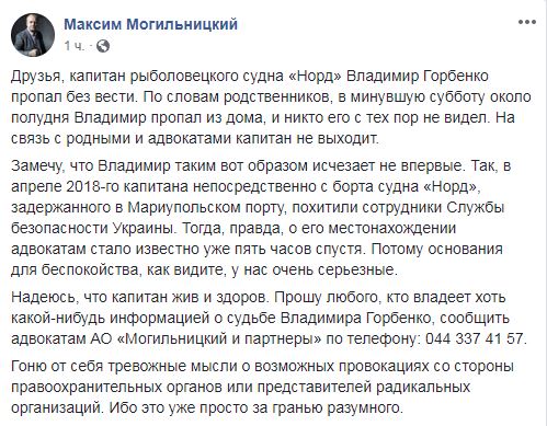 "Капитан рыболовецкого судна "Норд" Владимир Горбенко пропал без вести. По словам родственников, в минувшую субботу около полудня Владимир пропал из дома, и никто его с тех пор не видел. На связь с родными и адвокатами капитан не выходит", - написал адвокат.