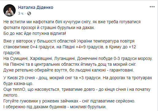 "Уже во вторник в большинстве областей Украины температура воздуха составит 0 + 4 градуса, на юге + 4 + 9 градусов, в Крыму до +12 градусов. На Сумщине, Харьковщине, Луганской, Донецкой побудет 0-3 градуса мороза. На севере и в центральных областях будут идти дождь и мокрый снег.Очень тщательно выбирайте обувь, потому что ледяные лужи - гарантированы. В Киеве 29 января - дождь, мокрый снег и 3 градуса. На дорогах и тротуарах будет невесть что",- написала она.