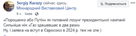 "Гениальная технология! А учитывая ещё более гениальный месседж кампании "Або Порошенко або Путин", хочу поздравить Сергея Таруту, Юлию Тимошенко, Анатолия Гриценко, Владимира Зеленского, Андрея Садового, Олега Ляшко и т.д. со званием "коллективный Путин". Это именно то, что о вас всех думает Порошенко" - написал пользователь.