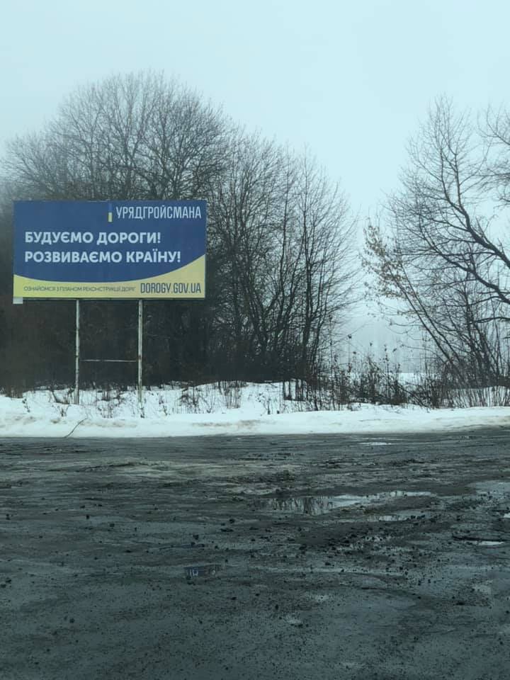 В Винницкой области рекламный бигборд правительства Гройсмана с фразой "Строим дороги" разместили прямо рядом с дорогой, усеянной ямами. Фотографию опубликовал в Facebook народный депутат от Батькивщины Алексей Рябчин.