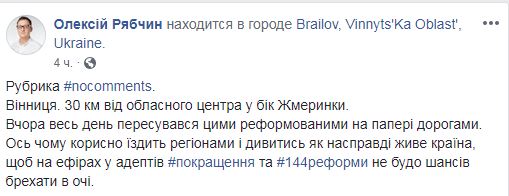 Так, сообщается, что снимок был сделан в Винницкой области в 30 км от областного центра в сторону Жмеринки. "Винница. 30 км от областного центра в сторону Жмеринки. Вчера весь день передвигался по этим реформированными на бумаге дорогами", - подписал фотографию депутат.
