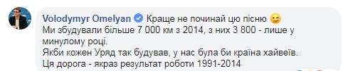 Свой комментарий под данной записью оставил министр инфраструктуры Украины Владимир Омелян. "Мы построили более 7 000 км с 2014, из них 3 800 - только в прошлом году. Если бы каждое правительство так строил, у нас была бы страна хайвеев. Эта дорога - как раз результат работы 1991-2014 годов", - написал Омелян.