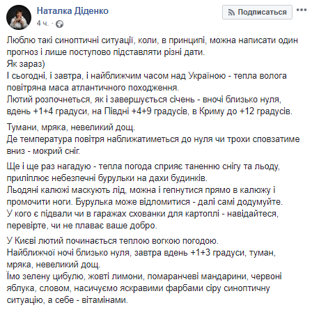 Февраль в Украине начнется с такой же погодой, какой заканчивался январь: будет тепло, пасмурно и дождливо. Об этом на своей странице в Facebook написала синоптик Наталья Диденко.