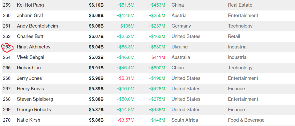 В опубликованном рейтинге видно, что донецкий бизнесмен поднялся на 263 строчку рейтинга и по-прежнему остается единственным украинцем в рейтинге самых богатых людей мира.