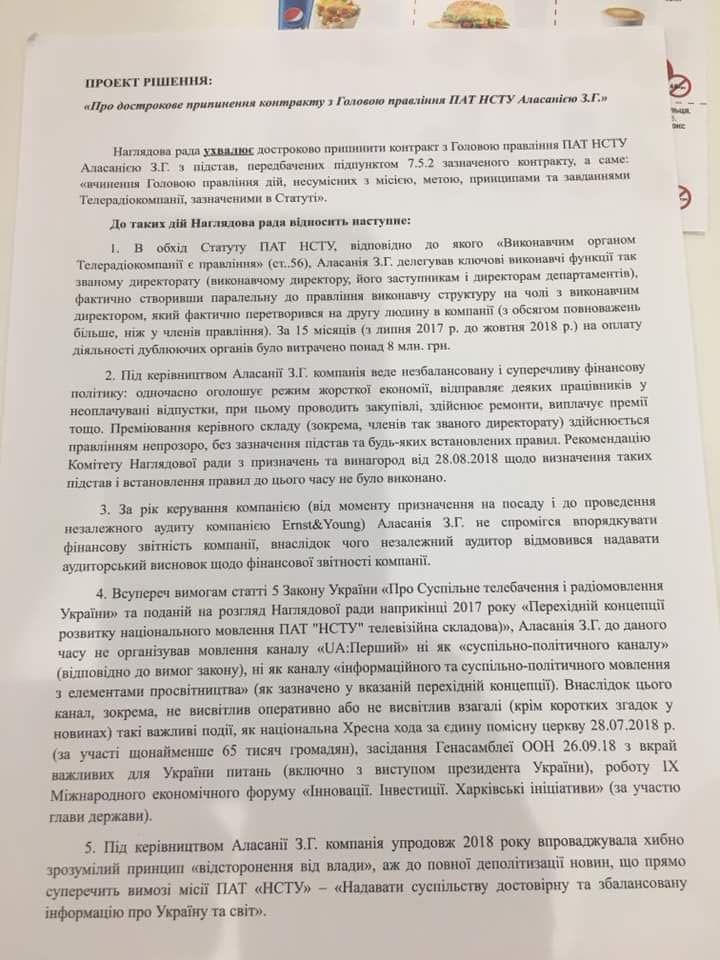 Также нецелесообразные выплаты премий руководству с одновременным введением антикризисных мер, несостоятельность финансового отчета. В то же время в нем содержится и скандальный пункт обвинений в том, что Аласания отказывался транслировать эфиры с участием Петра Порошенко.