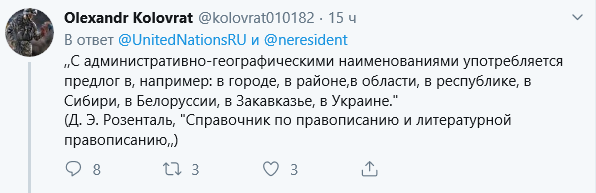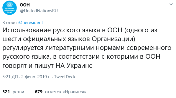 Представители ООН объяснили  почему со словом "Украина"употребляют предлог "на", а не "в". Об этом говорится в Twitter-аккаунте организации.